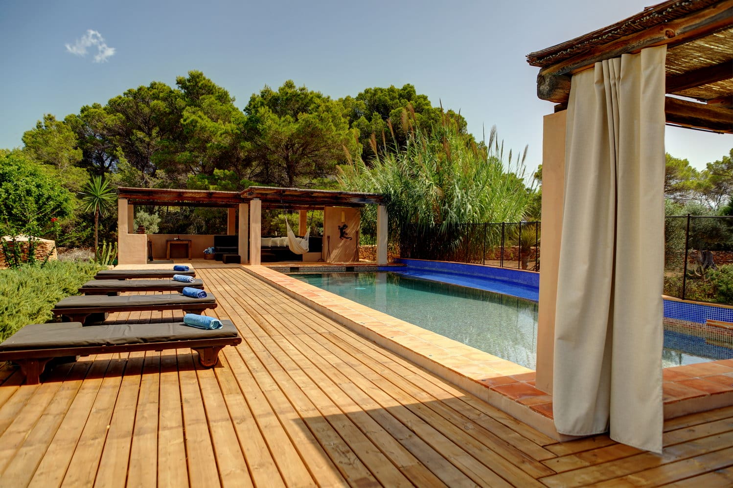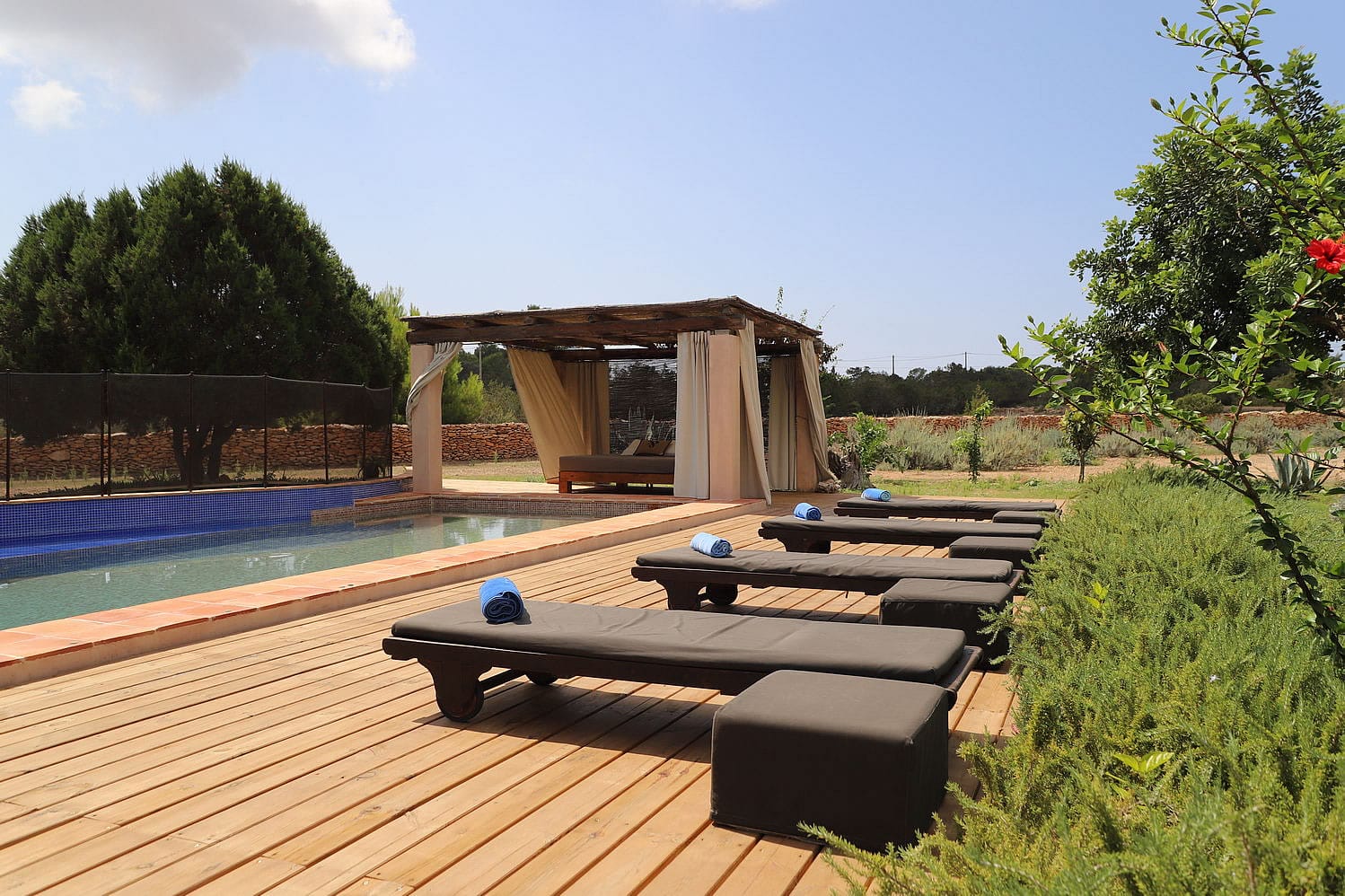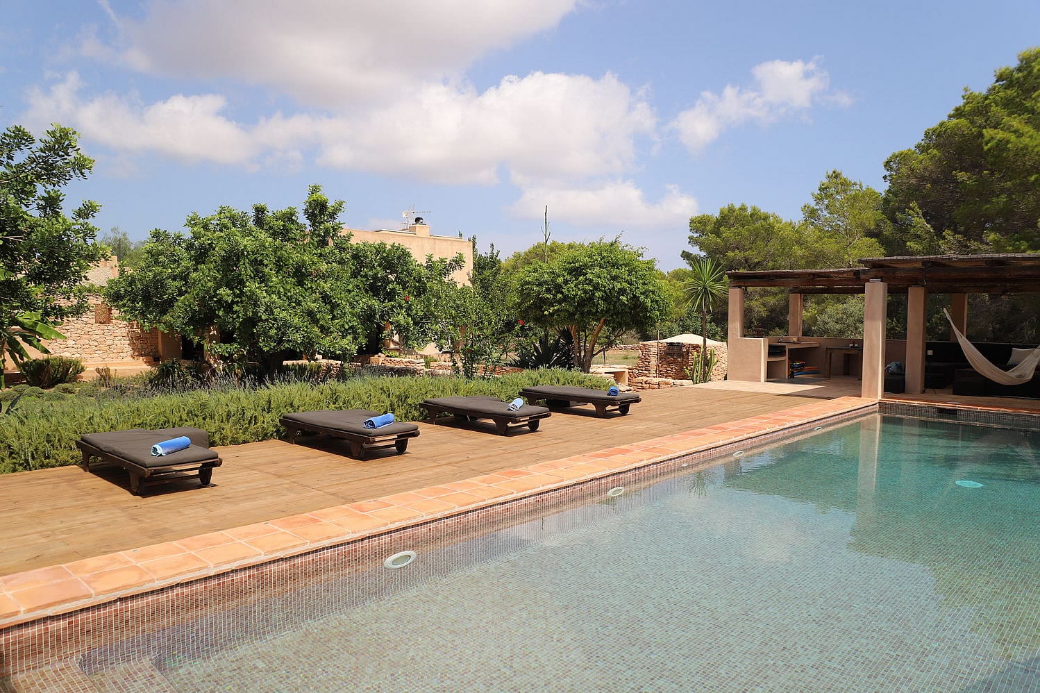 The large swimming pool is set in the garden and has at one end a BBQ and chill-out area with a wide range of sofas and sun beds surrounding the pool.