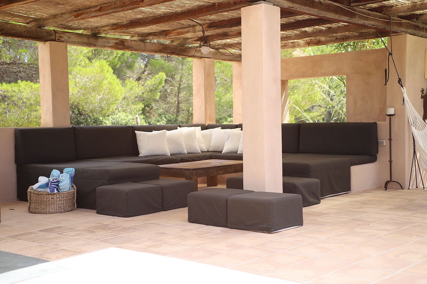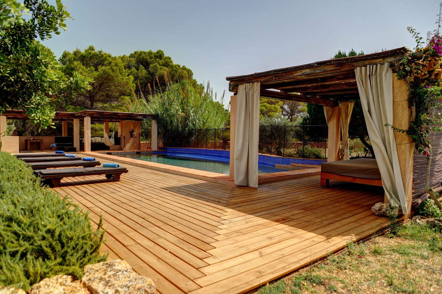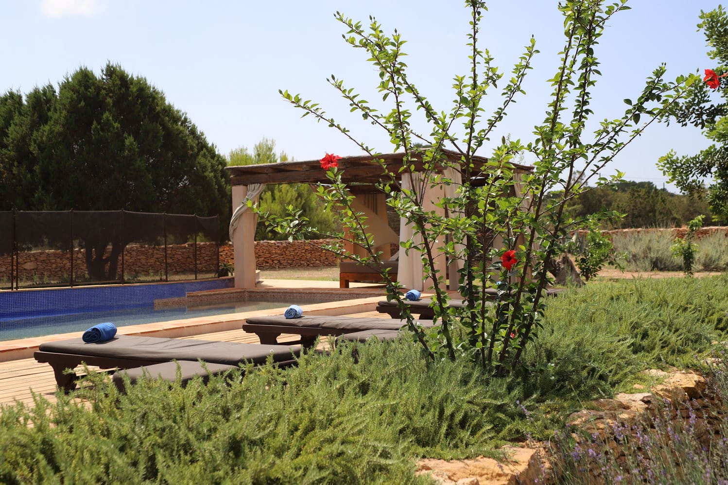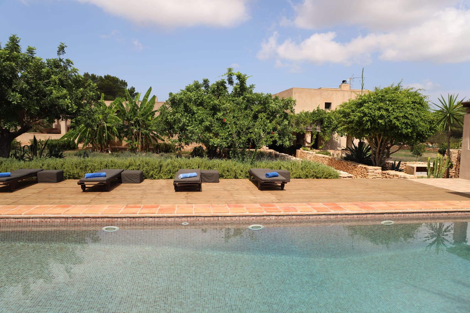 The large swimming pool is set in the garden and has at one end a BBQ and chill-out area with a wide range of sofas and sun beds surrounding the pool.