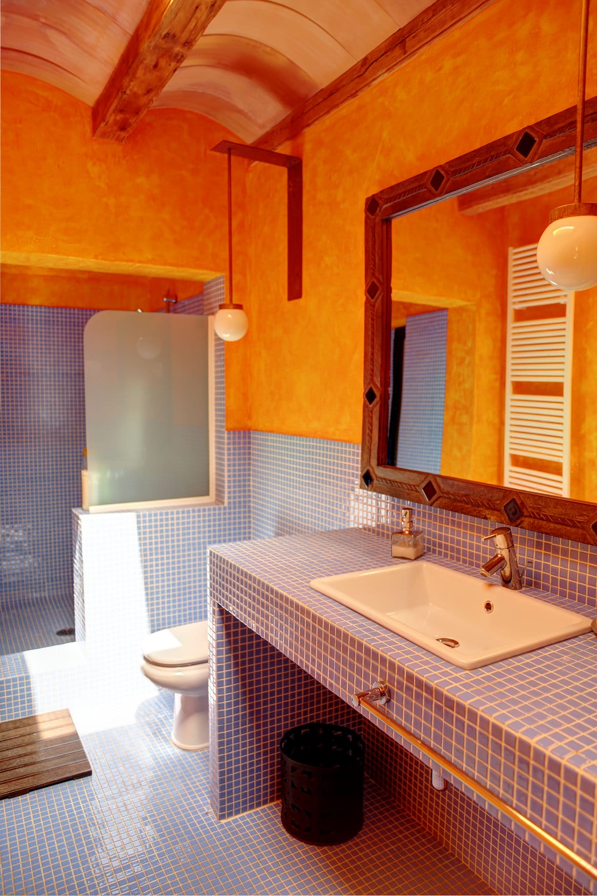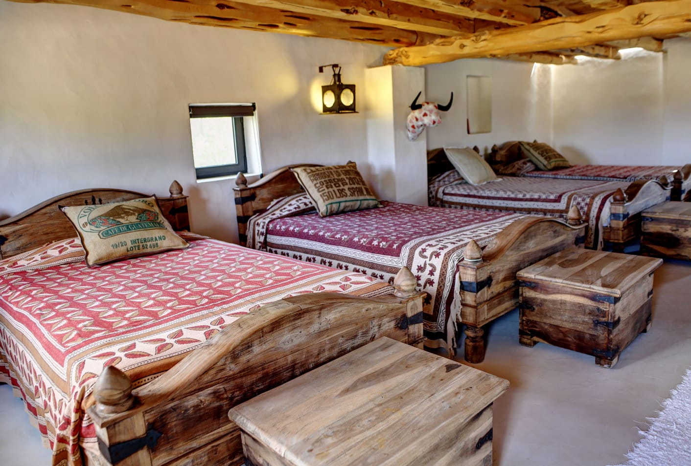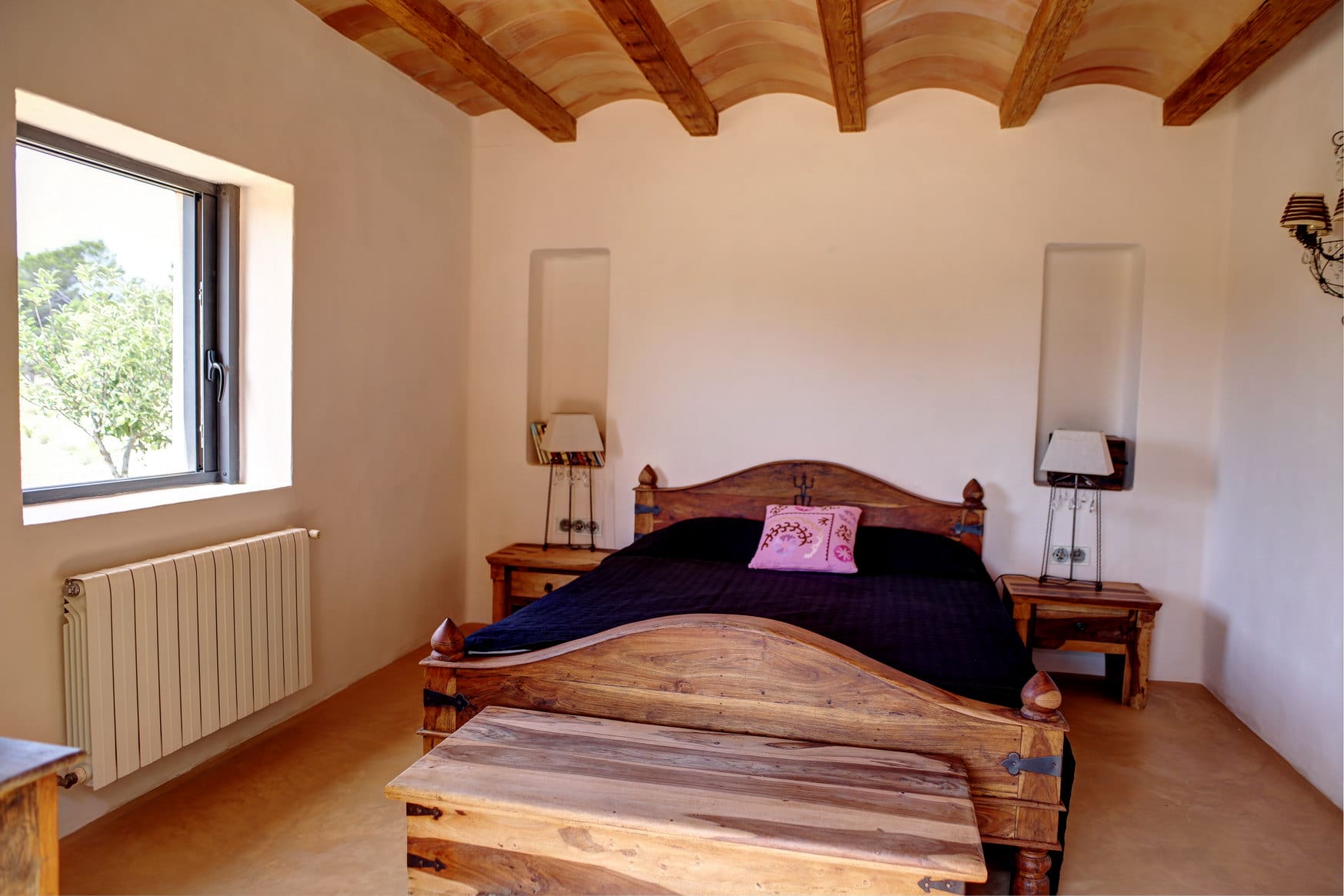 Double bedroom with dressing room, en suite bathroom with shower and direct access to the outside bathroom with jacuzzi. The bedroom on the loft above the livingroom has a 4 single beds.