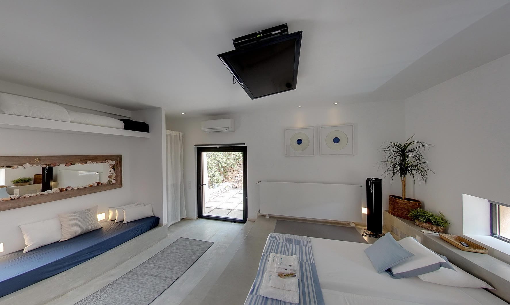 The designer furniture and the harmony of colors and fabrics creates a luxurious and serene atmosphere. The internal patio gives access to the 4 identical suites each with ensuite bathrooms and slightly differing personalities, each suite has TV in the ceiling and direct access to the exterior.