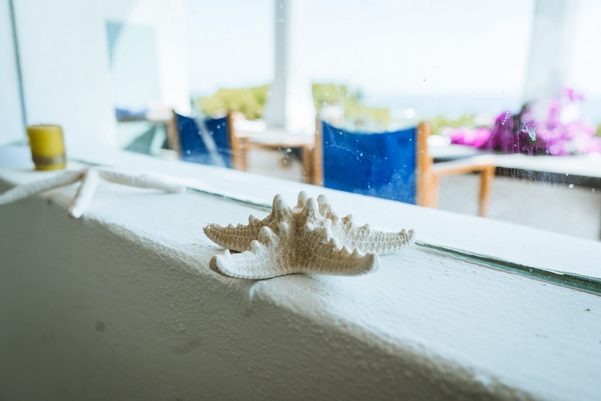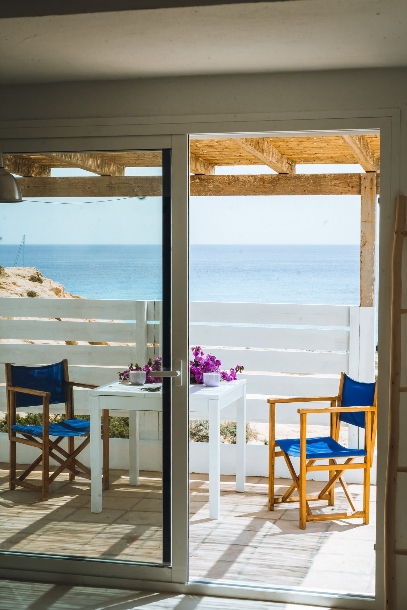 A nice and comfortable living room with views over the sea that has direct access to the porch furnished for outdoors living and breathtaking sea views.