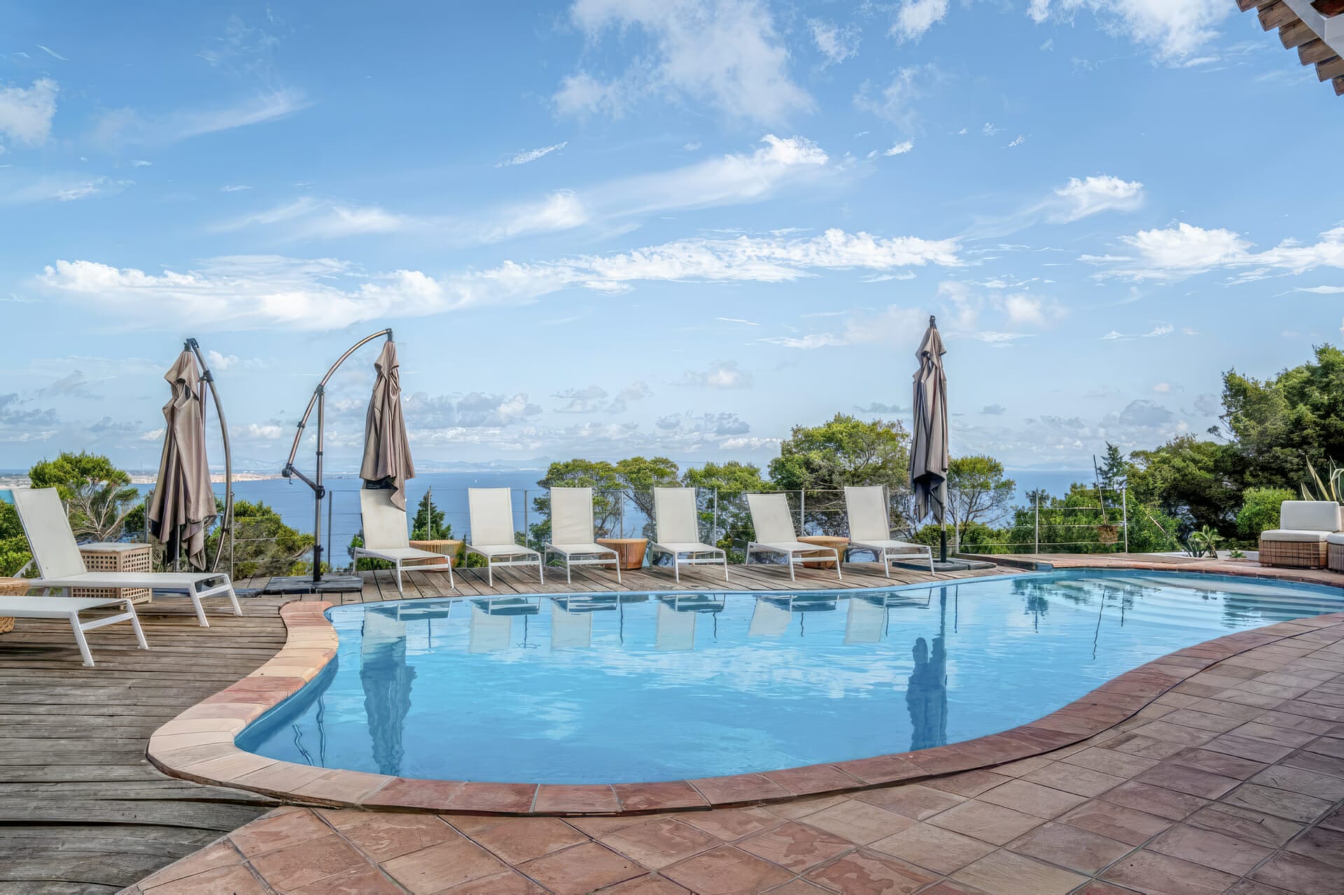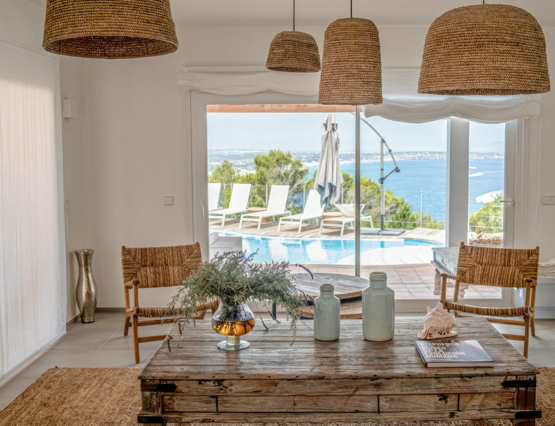 Perched on a hilly, terraced terrain, the villa has two floors. From the main entrance to the left, you enter directly into the wide and bright living room and open kitchen and dining room, from here there is direct access to the porch and pool.