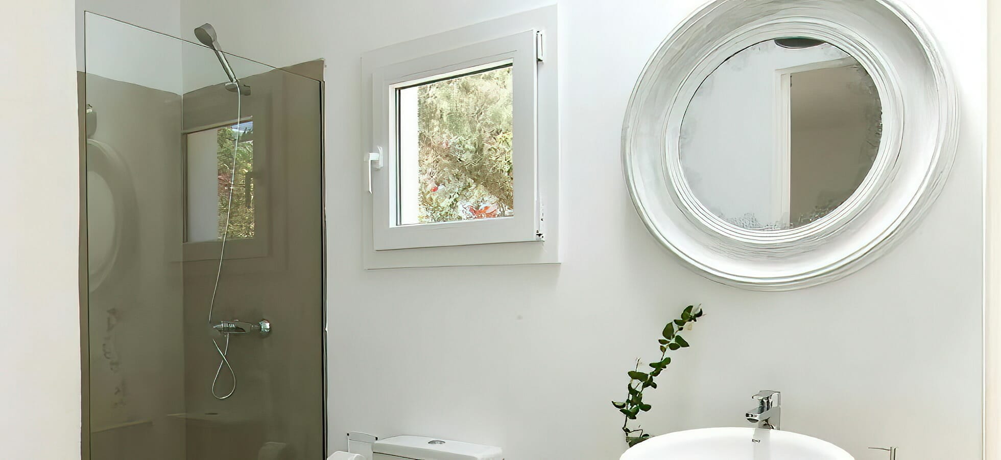 The main house features a spacious kitchen that is open to the living room and the dining room, as well as four bedrooms that each have their own bathroom and direct access to the garden and terrace.
