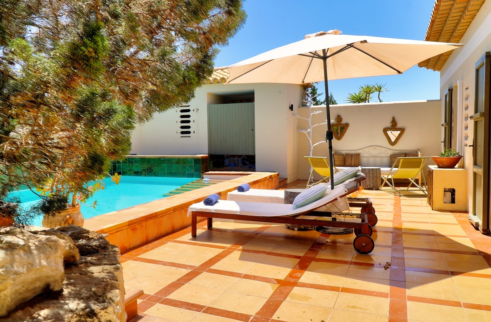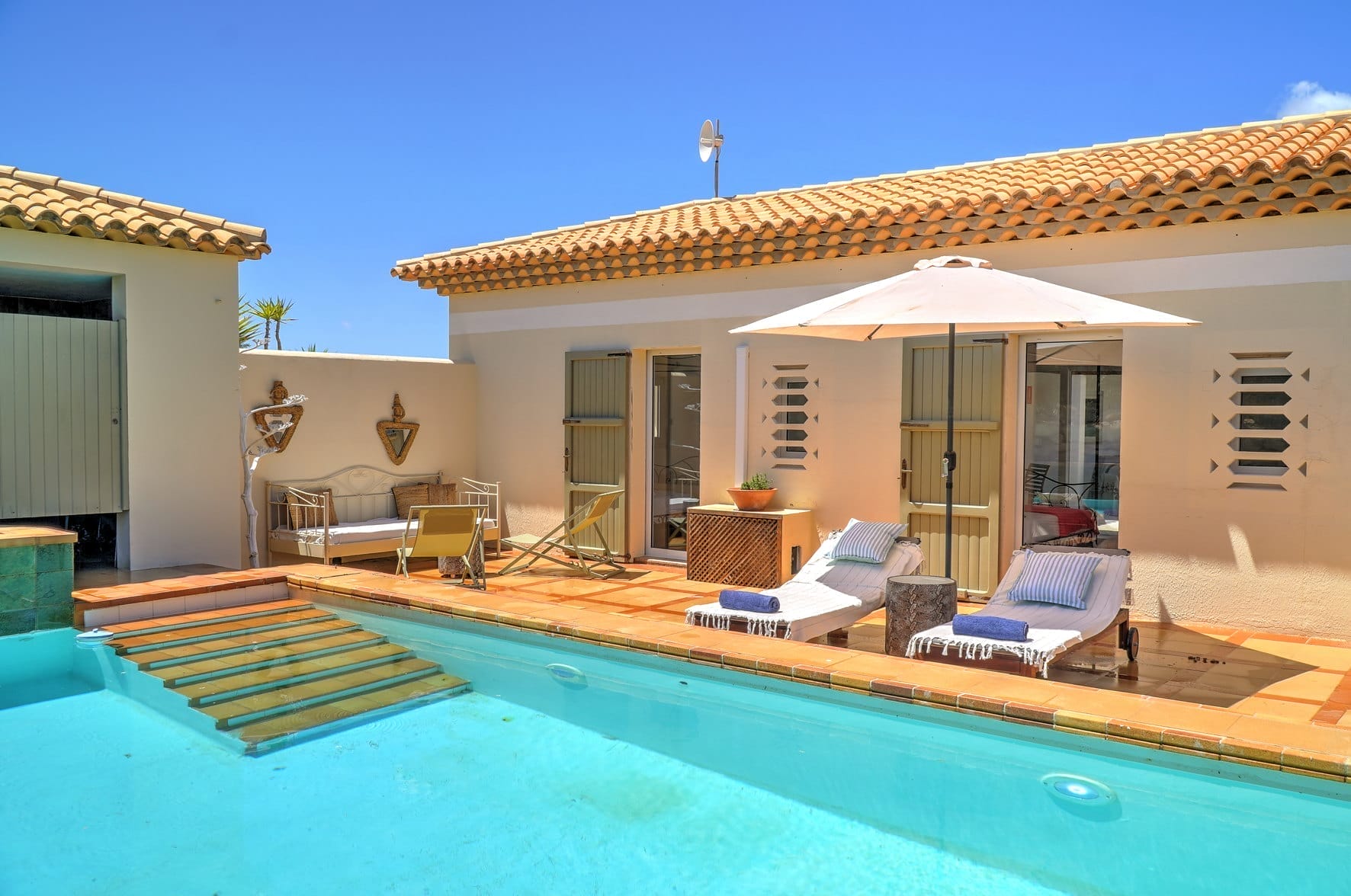 Along the exterior, there is a private pool that features a seating area with loungers and sofas. Additionally, the front porch features a dining table, chairs, and sofas that are perfect for lounging around.