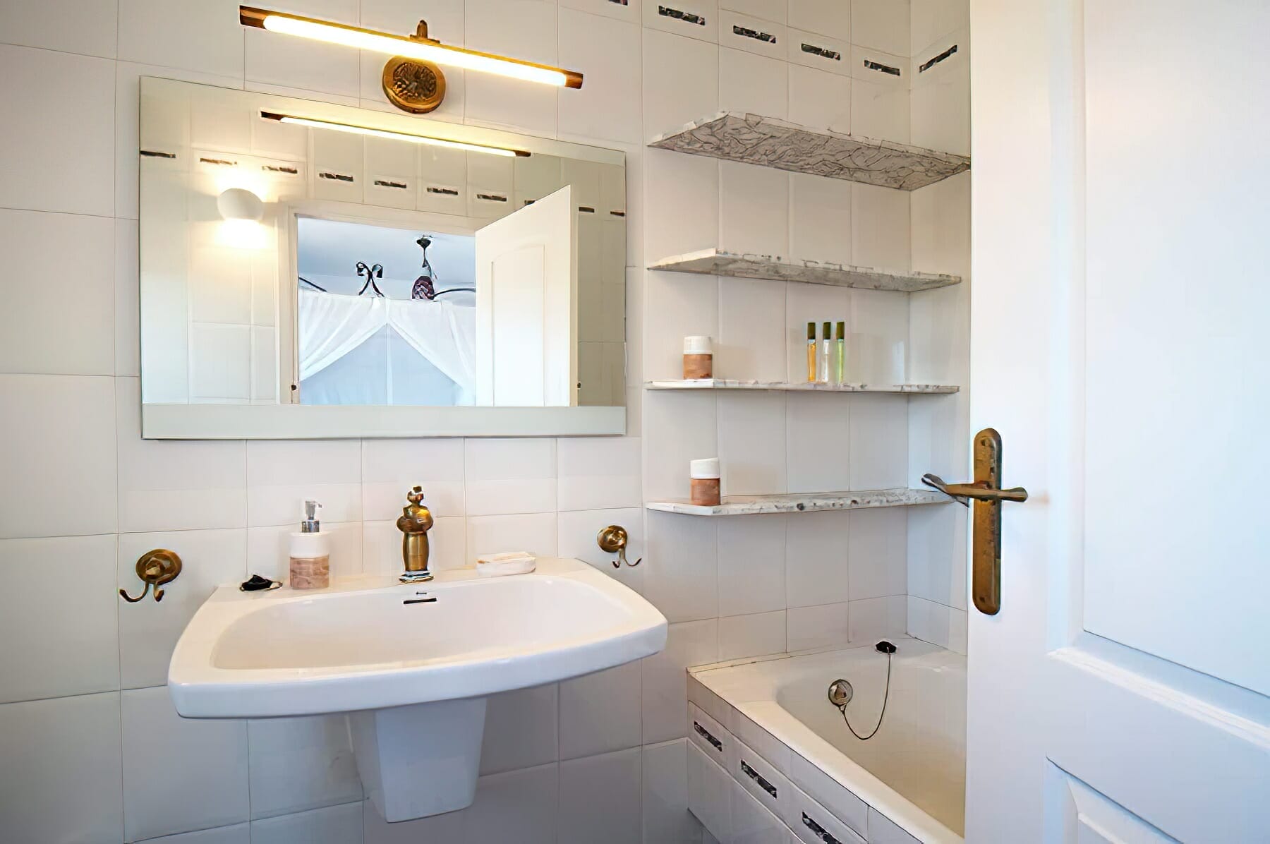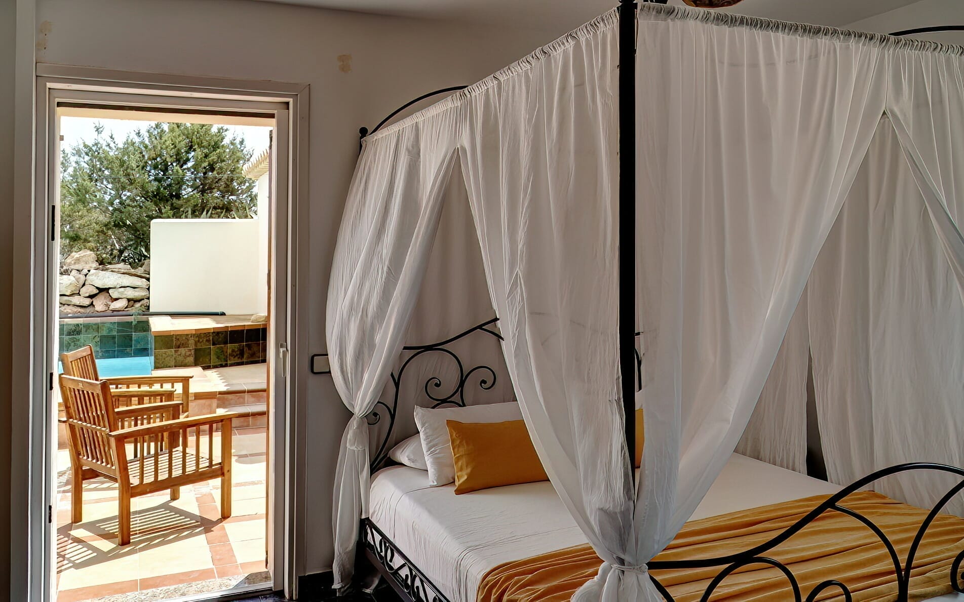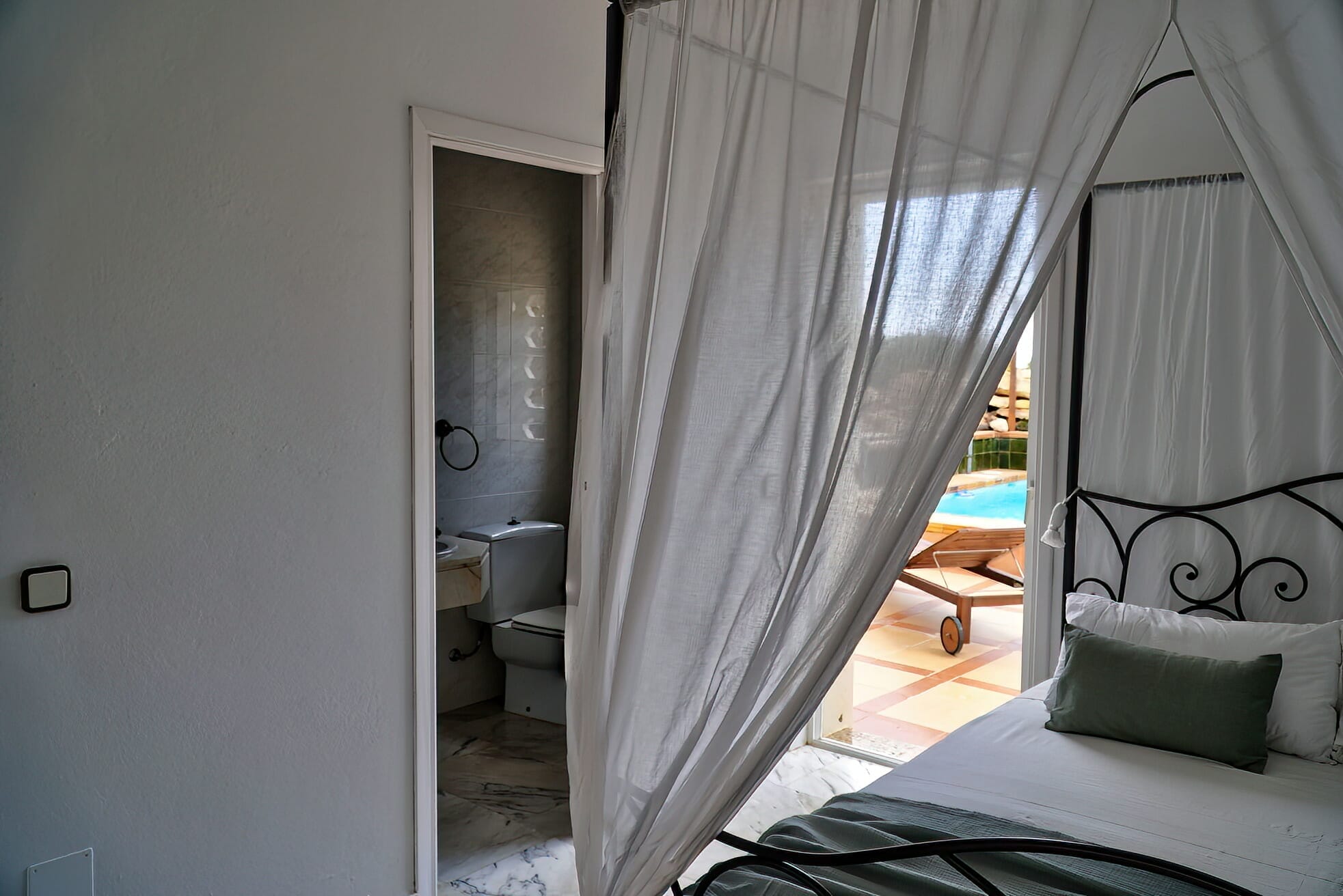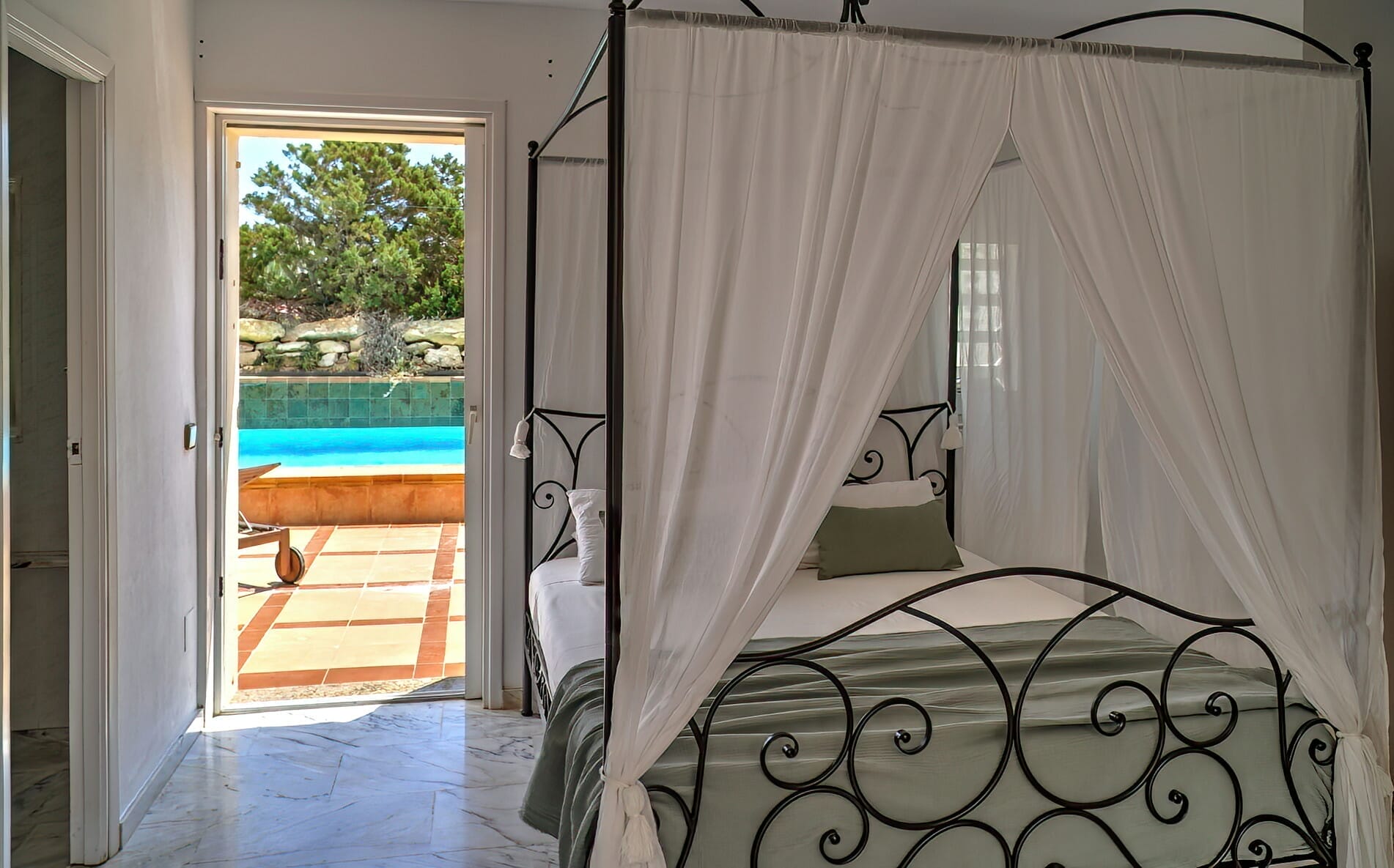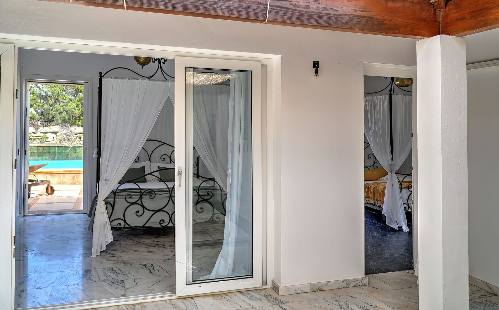 When we approach the villa through the front door, we see the massive inner terrace with an open ceiling that acts as a link between the bedrooms and the rest of the house. On the right, there is one en-suite double bedroom with access to the front porch, as well as two double bedrooms, each with a private bathroom and access to the pool terrace. The fourth bedroom, which is similarly en-suite, may be accessed from either the main entry or the living space.